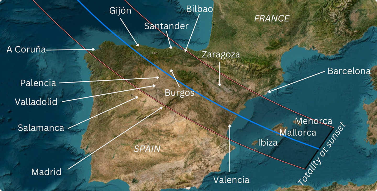 The path of totality in Spain stretches from A Coruña to Valencia and Palma de Mallorca, crossing key cities such as Oviedo, León, Burgos, Zaragoza, and Santander.