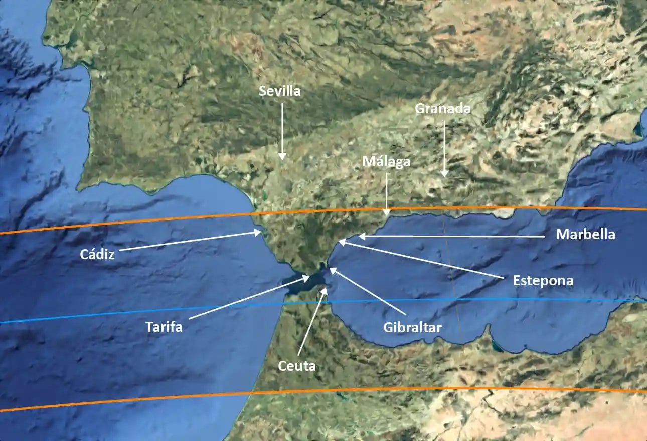 The Moon’s shadow will cross the Strait of Gibraltar, entering from the Atlantic, passing through the south of the Iberian Peninsula, and continuing across North Africa and the Middle East, reaching Egypt and Saudi Arabia.